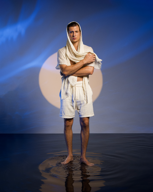 • Men’s boho chic shorts in blue, crafted from soft muslin Turkish cotton for summer comfort and style